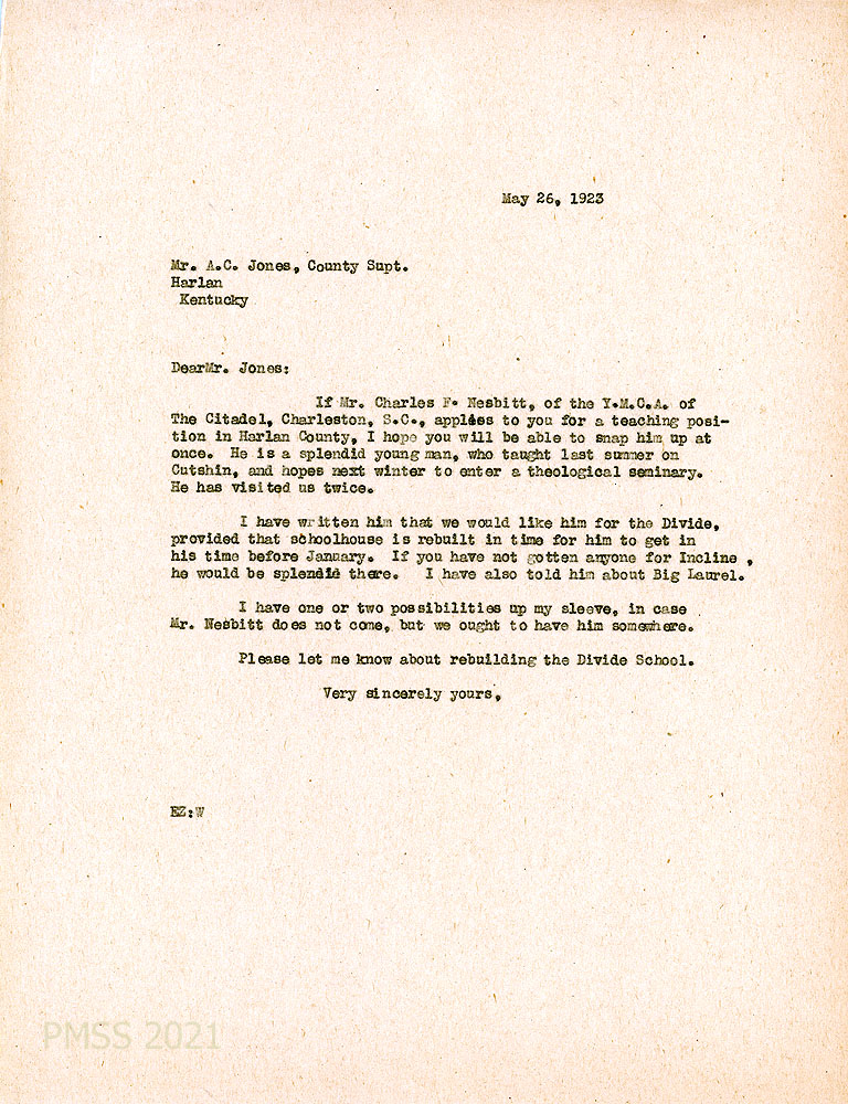 [011] May 26, 1923. To Mr. A.C. Jones, County Supt., Harlan, Kentucky, from EZ (Zande), who recommends Nesbitt: “He is a splendid young man, who taught last summer on Cutshin, and hopes next winter to enter a theological seminary. He has visited us twice.”