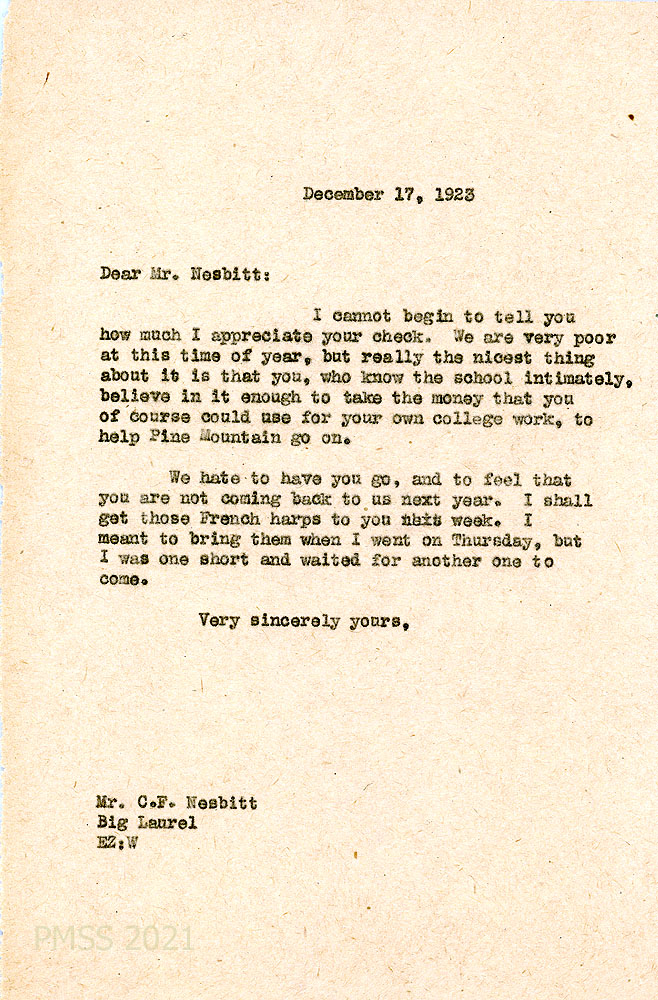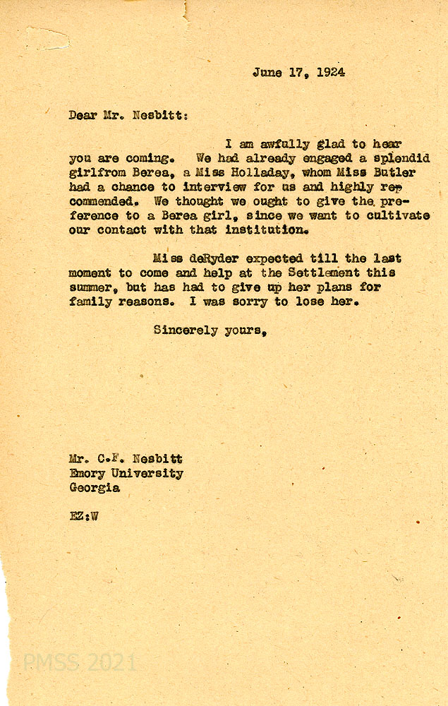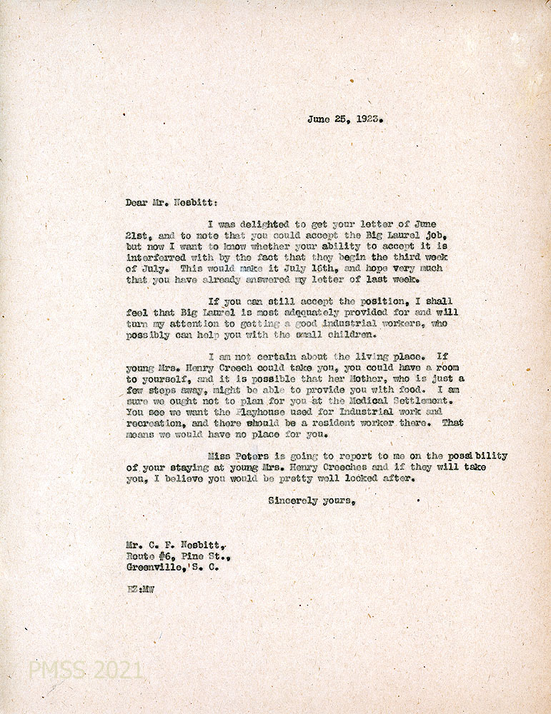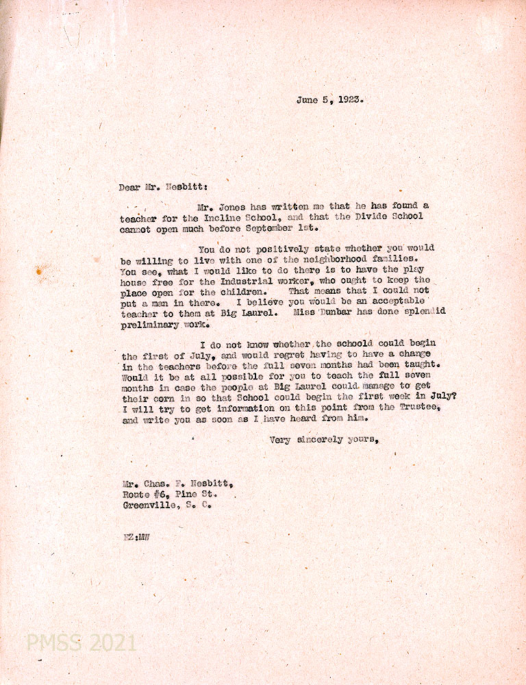 [013] June 5, 1923. To Nesbitt in Greenville, SC, from EZ (Zande), Jones has found a teacher for Incline School and Divide School will not be open “much before September 1st.”; asks if he is willing to live with one of the neighborhood families. “…I would like…to have the play house free for the Industrial worker, who ought to keep the place open for the children. That means that I could not put a man in there. I believe you would be an acceptable teacher to them at Big Laurel. Miss Dunbar has done splendid preliminary work.” She also asks if he would work the full seven months “in case the people at Big Laurel could manage to get their corn in so that School could begin the first week of July?” She will consult the trustee about this.