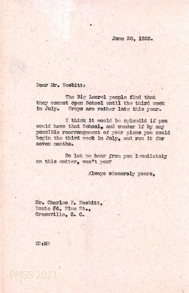 [015] June 20, 1923. To Nesbitt from EZ (Zande). “The Big Laurel people find that they cannot open School until the third week in July. Crops are rather late this year.” Asks Nesbitt if he can rearrange his plans.