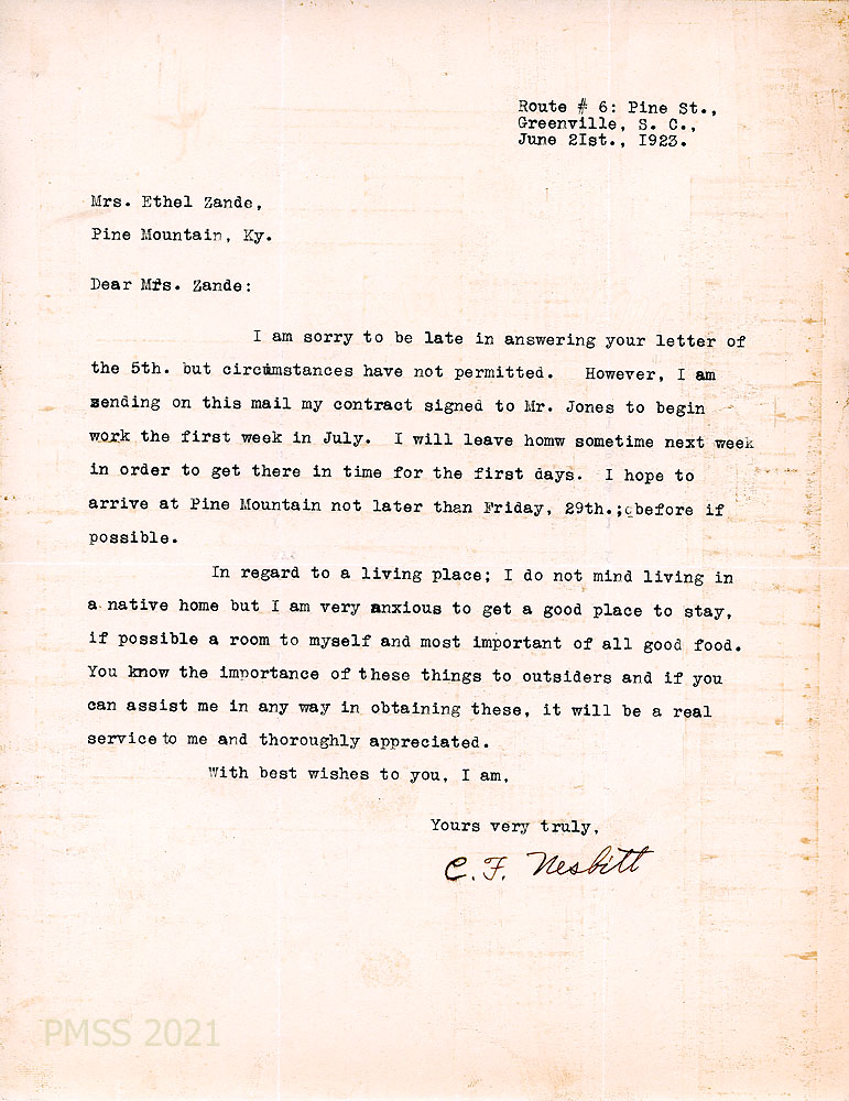 [012] June 2, 1923. To Zande from Nesbitt, who is writing to Jones; accepts the offer to teach at Incline or Big Laurel school for 6 1/2 months, beginning in July. He is leaving Charleston and provides his home address in Greenville, SC.