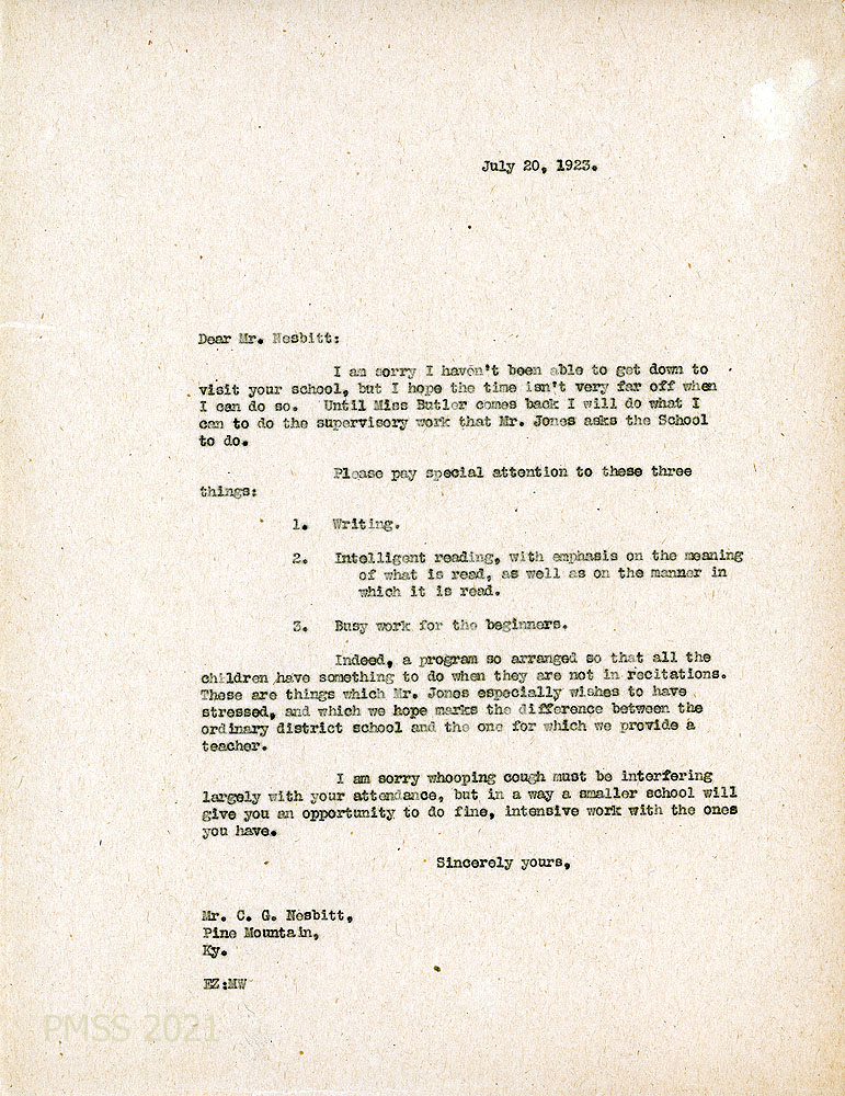 [018] July 20, 1923. To Nesbitt at Pine Mountain, KY, from EZ (Zande), who apologizes for not visiting his school yet. “Until Miss [Marguerite] Butler comes back I will do what I can to do the supervisory work that Mr. Jones asks the School to do.” Asks Nesbit to emphasize writing, “intelligent reading” and “busy work for the beginners.” Regrets that whooping cough is affecting attendance “but in a way a smaller school will give you an opportunity to do fine, intensive work with the one you have.”