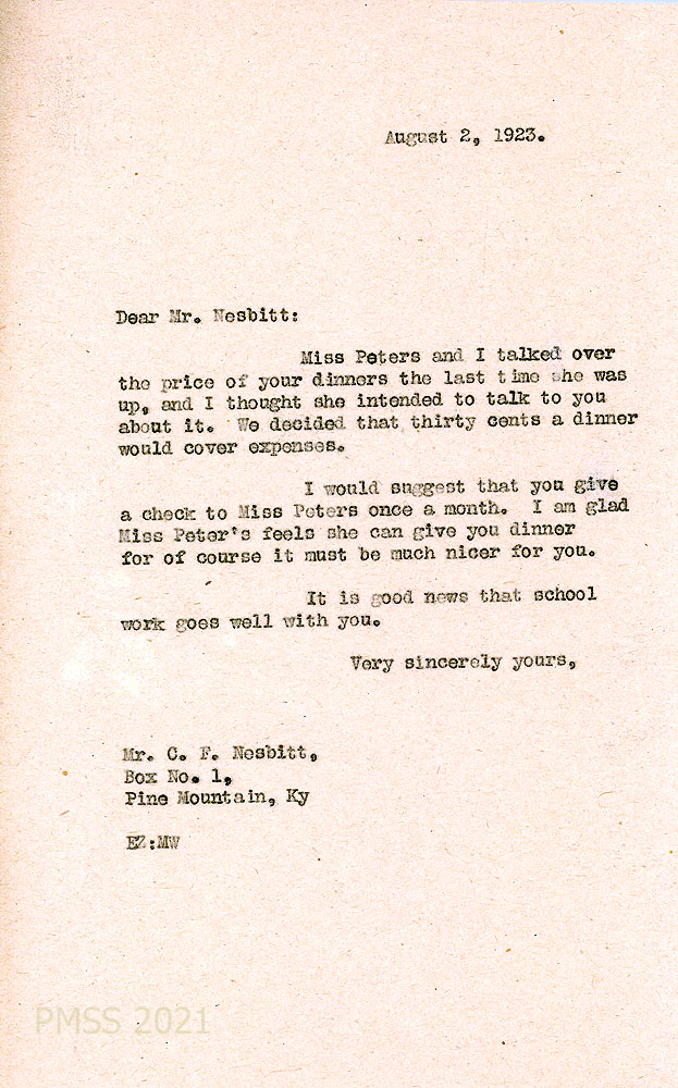 [020] August 2, 1923. To Nesbitt from EZ (Zande), stating that she and Miss Peters decided that “thirty cents a dinner would cover expenses.”