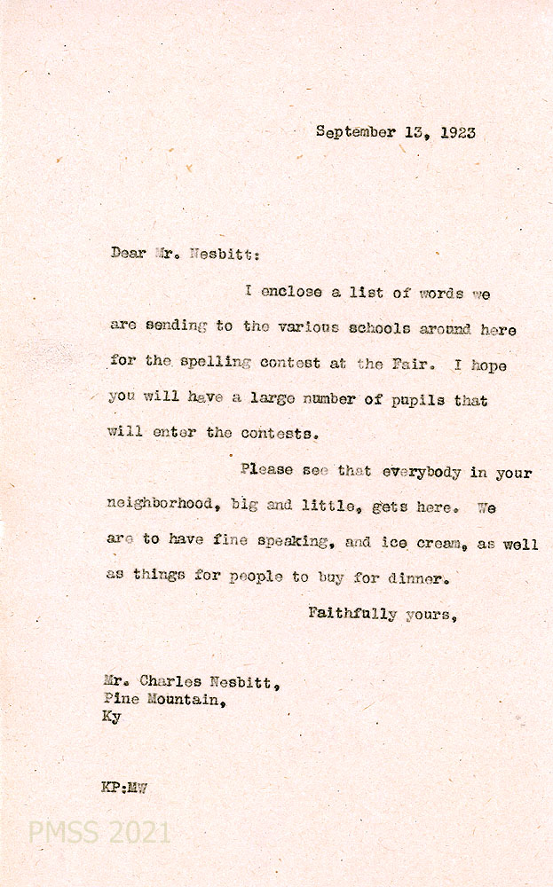 [021] August 13, 1923. To Nesbitt from KP (Pettit), who encloses a list of words for the spelling contest at the Fair. She asks him to see that his pupils and the neighbors will attend. “We are to have fine speaking, and ice cream, as well as things for people to buy for dinner.”
