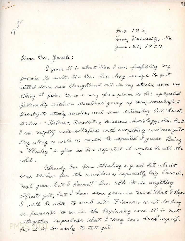 [009] May 23, 1923. To Zande from Nesbitt, who is still undecided what to do for summer but will enter Emory University in Atlanta, GA next September or January. Asks about summer teaching at the Hurricane Gap or Divide schools. Tells about his correspondence with Pettit. “In addition to my teaching in the mountains last summer, I had taught some previously in night schools during my college course.”