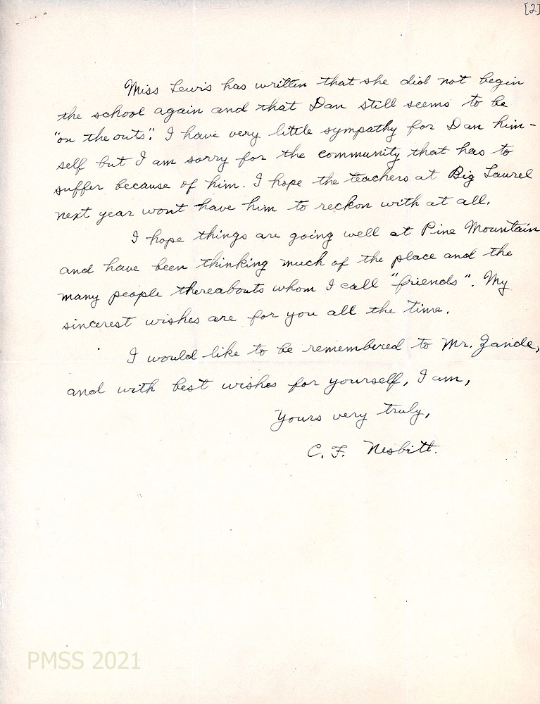 [025] [date? PAGE 1 IS MISSING.] Page 2 of a letter to [?] from Nesbitt. “I hope things are going well at Pine Mountain and have been thinking much of the place and the many people thereabouts whom I call ‘friends.’ My sincerest wishes are for you all the time.”