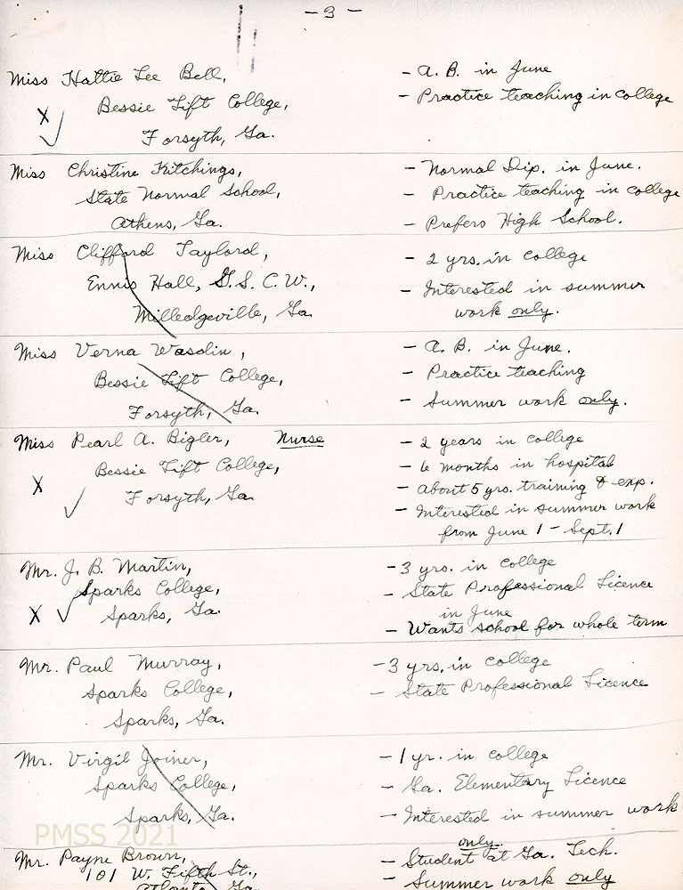 [027], [027a] [date? PAGE 1 IS MISSING.] Pages 2 and 3 of list of prospects for PMSS teaching positions with their addresses, education and experiences.
