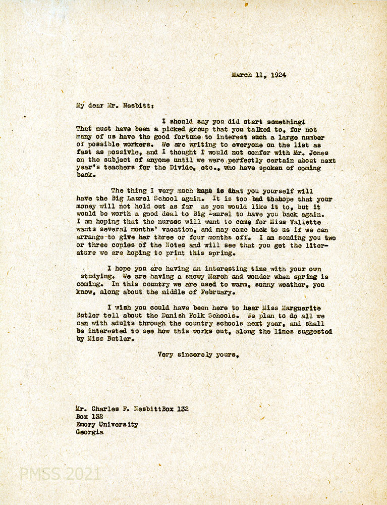 [028] March 11, 1924. To Nesbitt at Emory University, Atlanta, Georgia, from [unsigned, likely EZ], who is impressed with the prospect list and is writing to each one on the list. She hopes Nesbitt will return to Big Laurel next year; mentions needing nurses to return to fill in for Miss Vallette who wants several months’ vacation. Mentions Marguerite Butler’s talks about the Danish Folk Schools.