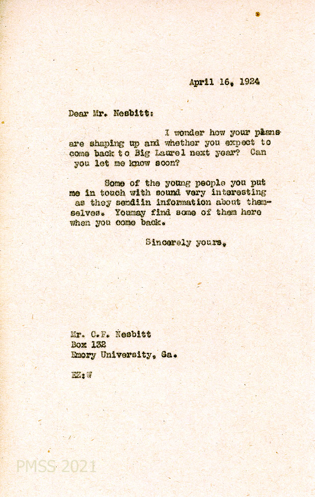 [031] May 6, 1924. To Nesbitt from EZ (Zande), wishing him well and expressing hope that he will return to Big Laurel. “Big Laurel is to be a two-teacher school, and we shall try first of all to have the primary teacher a Berea graduate, for we think they ought to have preference. If we cannot find the right person at Berea, we will draw on your reserves.”