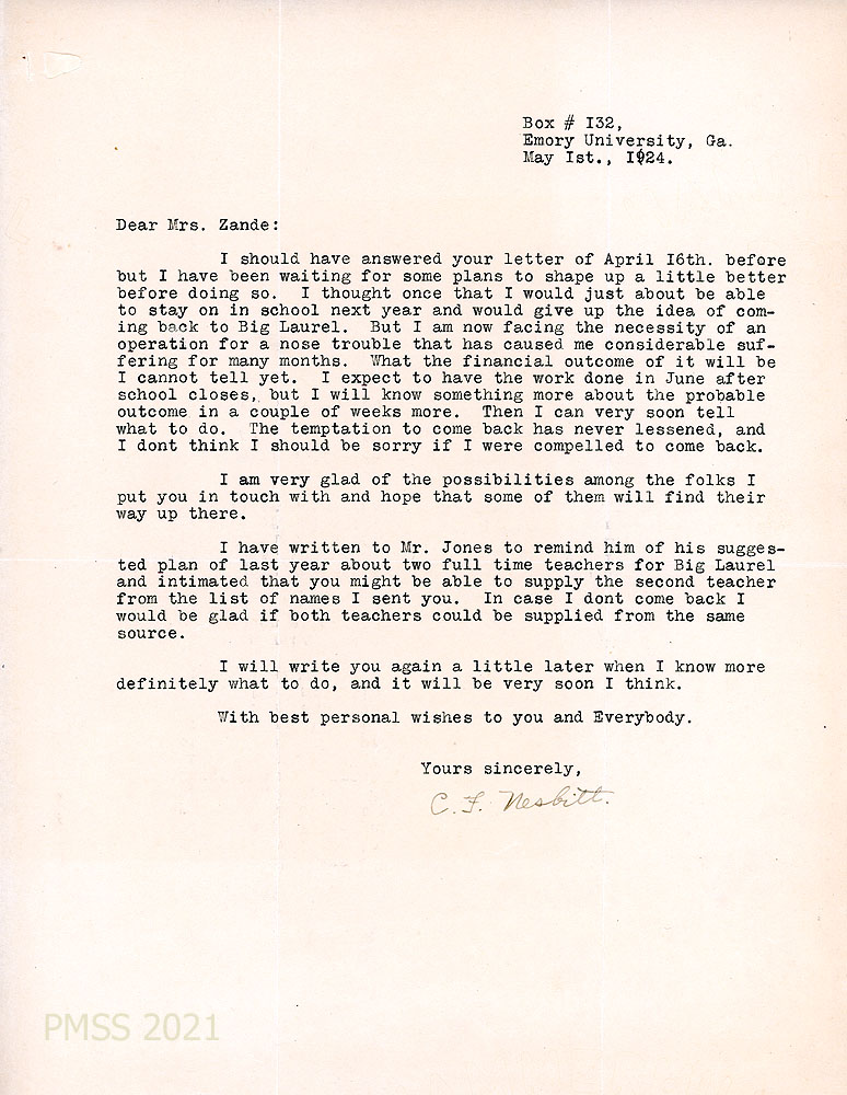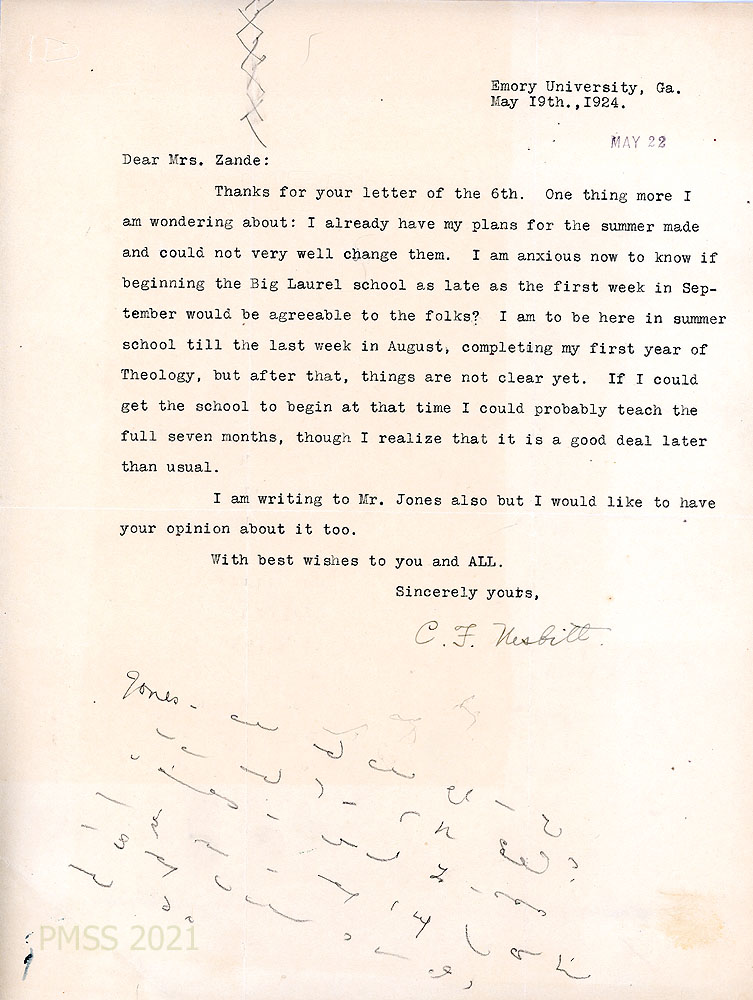 [032] May 19, 1924. Typewritten letter to Zande from Nesbitt, who asks if Big Laurel school could begin in the first week in September. He will be at Emory summer school until the end of August, “completing my first year of Theology….” He is also asking Mr. Jones.