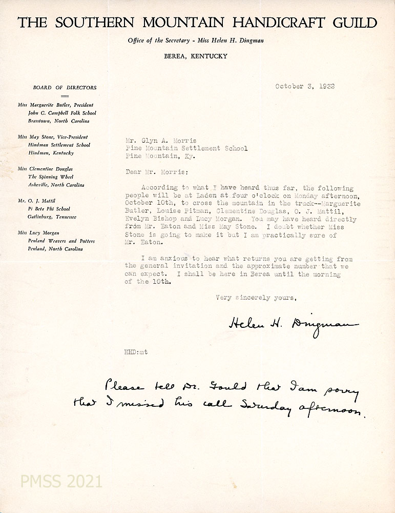 [010] September 21, 1932. Form letter to Morris from Dingman, announcing the fall meeting of the Southern Mountain Handicraft Guild at Pine Mountain Settlement School on October 12. Provides directions for arriving at Putney to take a logging train to PMSS and leaving their cars at one-car garages in Putney; cost of room and board; send RSVP to Morris; asks that each center brings “a small collection of [their] most significant articles….” Plans will be made for a Guild exhibit to be sent around the country by the American Federation of Arts. Mr. Allen Eaton is working on the project.