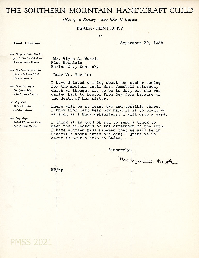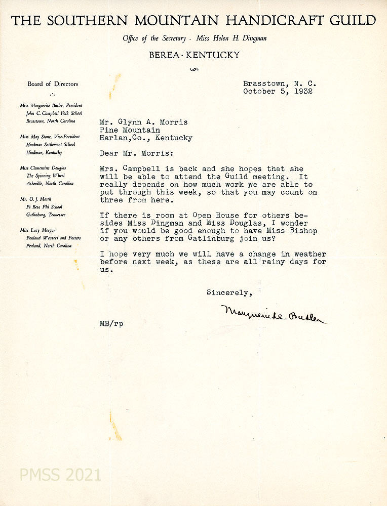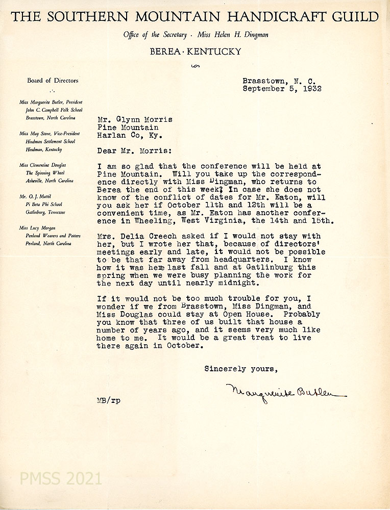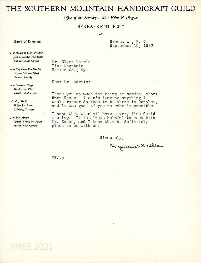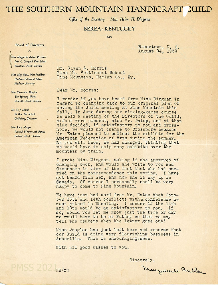 [003] August 24, 1932. To Morris from Marguerite Butler, President, on letterhead for The Southern Mountain Handicraft Guild, Berea, KY. The directors have changed back to their “original plan of having the Guild meeting at Pine Mountain this fall … because Mr. Eaton planned to collect the exhibits for the American Federation of Arts during the summer.” Asks about scheduling the meeting. She heard from Miss Douglas that “our Guild is doing very flourishing business in Asheville.”
