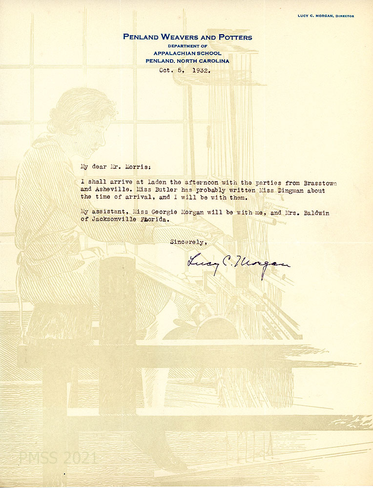 [023] October 5, 1932. To Morris from Lucy C. Morgan, Director, on letterhead for Penland (NC) Weavers and Potters. Will arrive with the parties from Brasstown and Asheville.