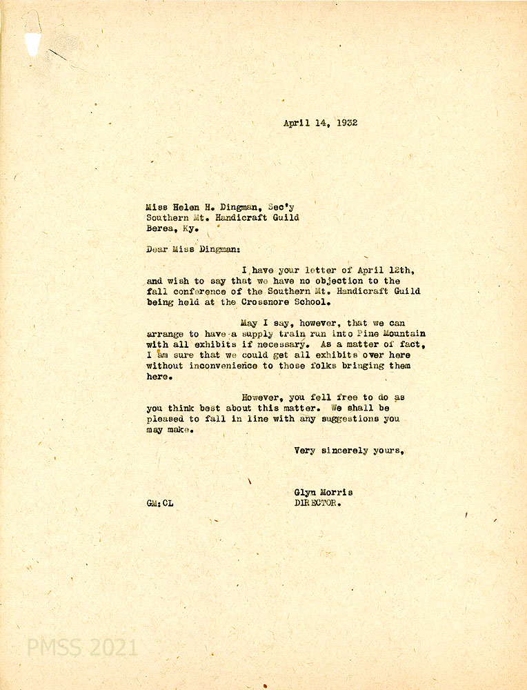 [001] April 12, 1932. To Glyn A. Morris, PMSS Director, from Miss Helen H. Dingman, Office of the Secretary, on letterhead for The Southern Mountain Handicraft Guild, Berea, KY. Asks if the Guild could move the fall meeting, originally to be held at PMSS, to a more accessible place in order that members could more easily bring their best crafts to be assembled for an exhibit; possibly at Crossnore (NC) School. Mentions Mr. Delbert Eagle who is applying for PMSS school principal.