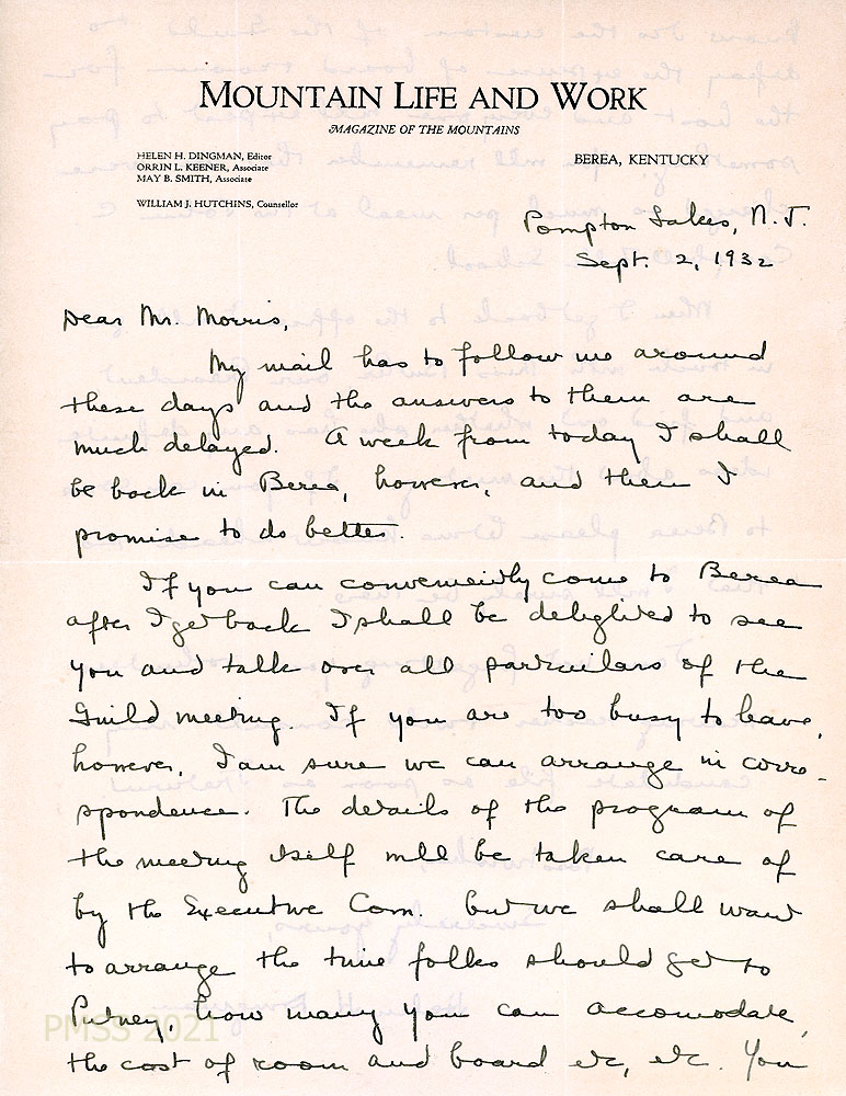 [005], [005a] September 2, 1932. Two-page handwritten letter to Morris from Dingman, Editor, on letterhead for Mountain Life and Work: Magazine of the Mountains, Berea, KY. She is currently at Pompton Lakes, NJ, but will return to Berea in a week and asks him to visit her then about the Guild meeting at PMSS. “…[I]t is the custom of the Guild to defray the expense of board & room for the hose and everyone will expect to pay something.” She will check her files for a volunteer weaving teacher for PMSS.