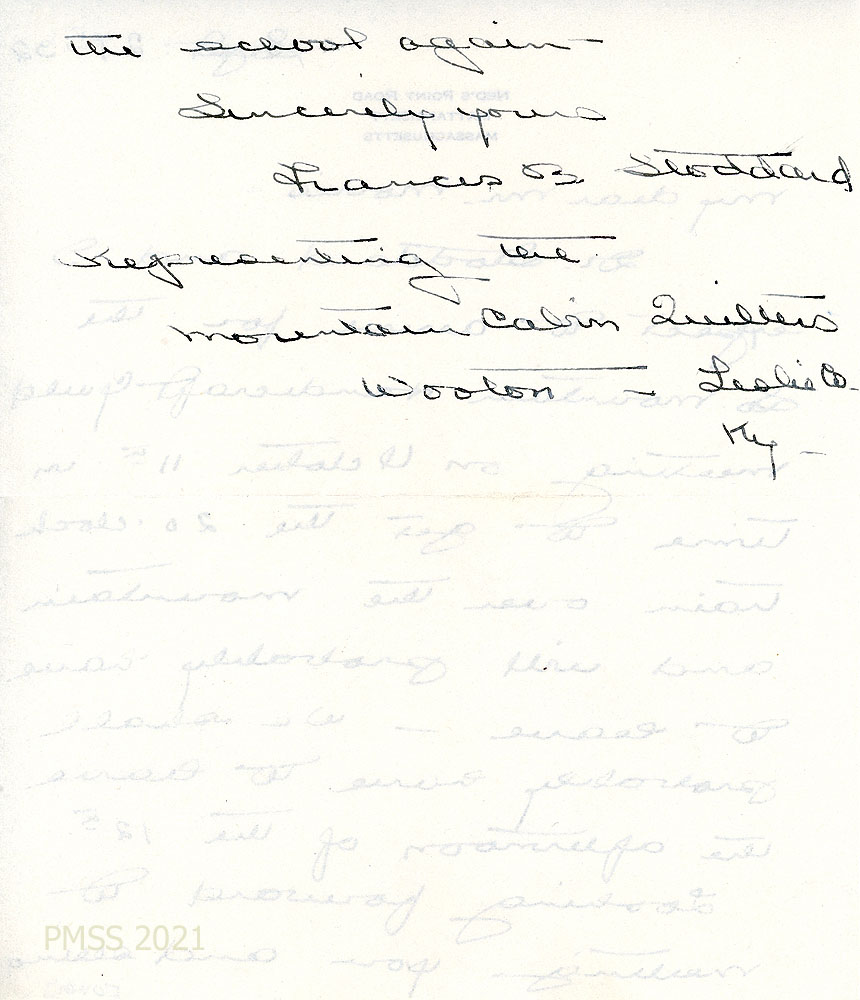 [014], [014a] September 27, 1932. Two-page handwritten letter to Morris from Frances B. Stoddard in Mattapoisett, MA. She and Dr. Stoddard’s arrival and departure details. Stoddard represents the Mountain Cabin Quilters, Wooton, Leslie Co., KY.