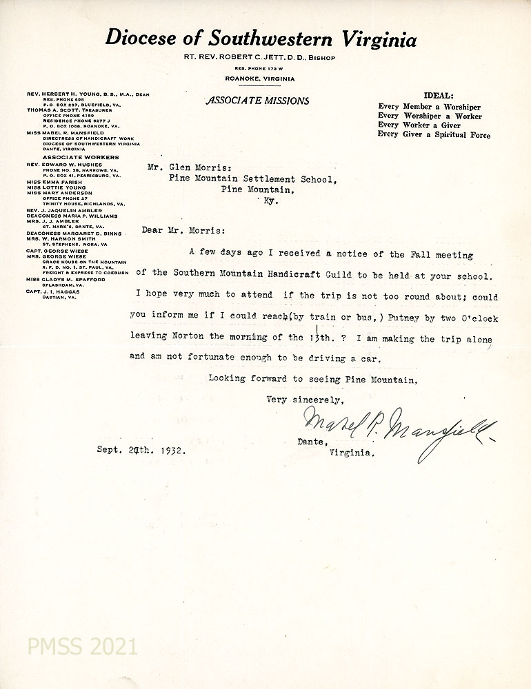 [015] September 20, 1932. To Morris from Mabel R. Mansfield in Dante, VA, on letterhead for the Diocese of Southwestern Virginia in Roanoke, VA. Will attend, but needs to know if she can reach Putney by 2:00 on October 13 via train or bus.
