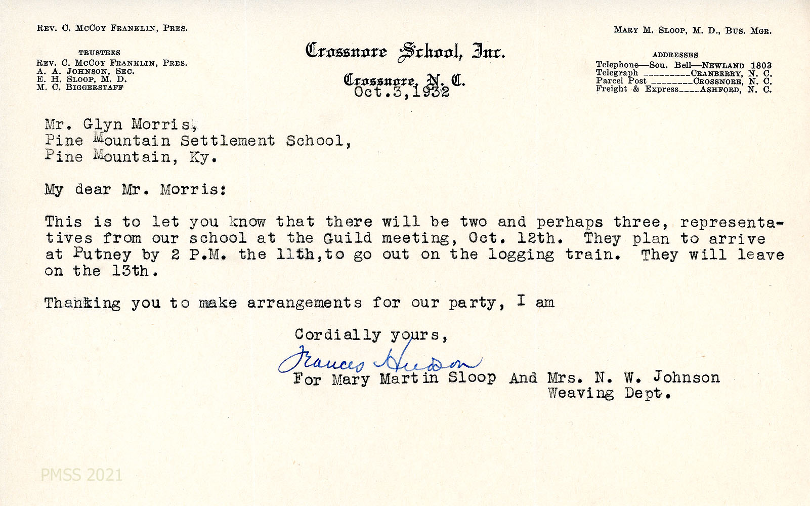 [019] October 3, 1932. To Morris from Frances Hudson (for Mary Martin Sloop and Mrs. N.W. Johnson, Weaving Dept.) on letterhead for Crossnore (NC) School, Inc. Two or three will attend.