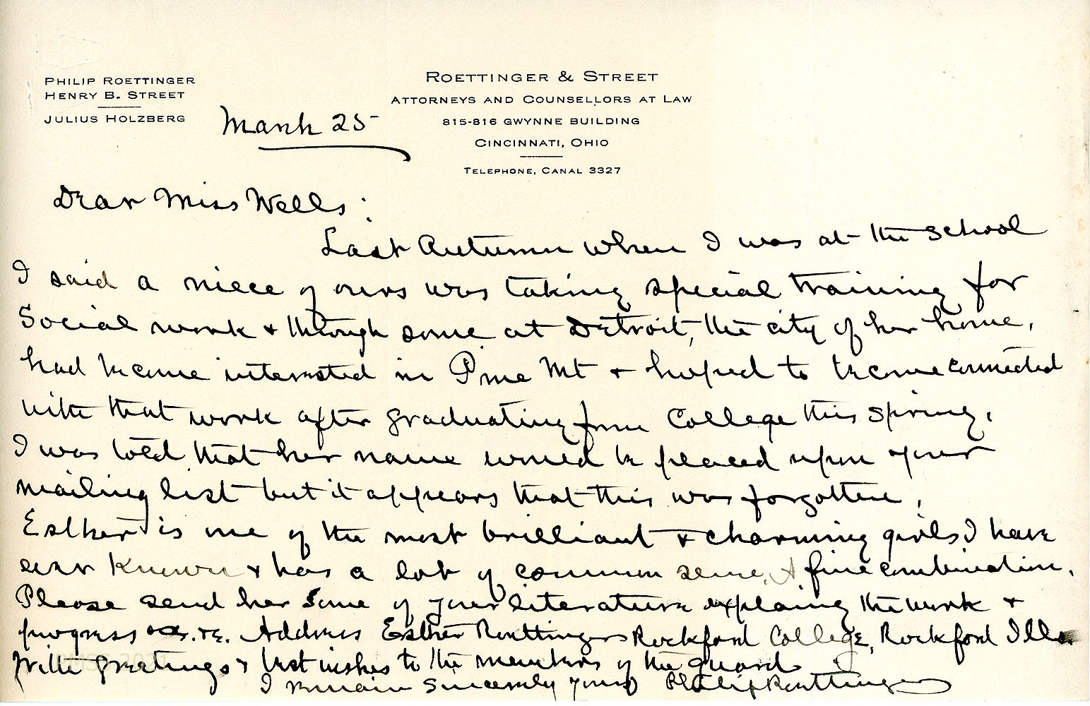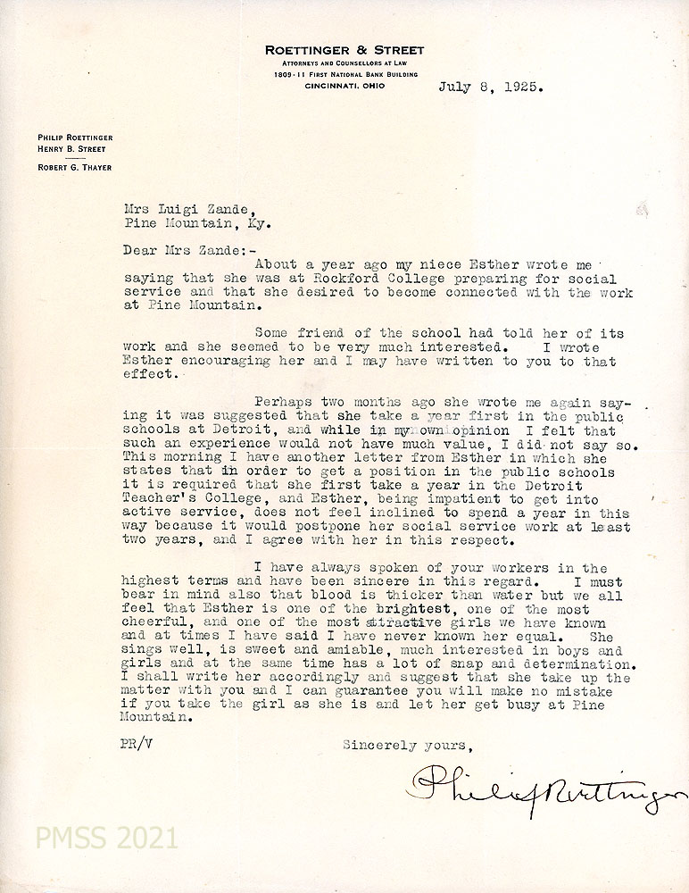[001] March 25, [no year]. To Evelyn K. Wells from Philip Roettinger [PMSS Trustee] on letterhead for “Roettinger & Street, Attorneys and Counsellors at Law, Cincinnati, Ohio.” Describes his niece, Esther Roettinger, who is studying social work and is interested in PMSS work after she graduates from college in the spring. “Esther is one of the most brilliant & charming girls I have ever known & has a lot of common sense.” He asks that PMSS send literature to her at Rockford ((IL) College.
