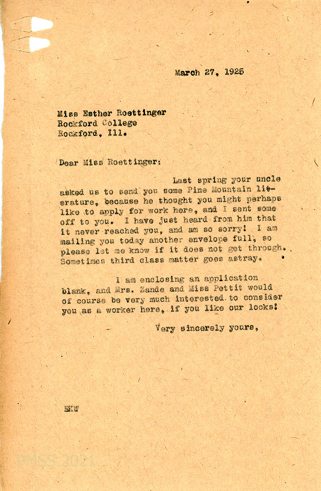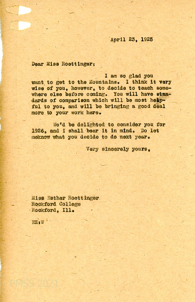 [003] March 27, 1925. To Esther Roettinger at Rockford (IL) College, from EKW (Wells), who is enclosing PMSS literature and an application blank.
