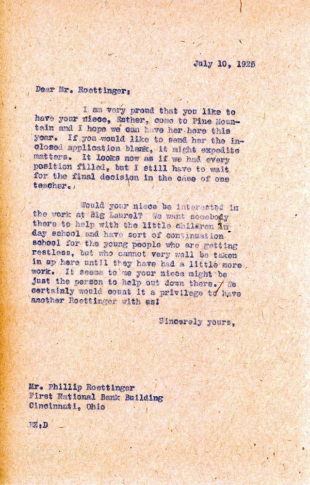 [007] July 10, 1925. To Mr. Roettinger from EZ (Zande), who will accept Esther this year and suggests that she work at Big Laurel to “help with the little children in day school and have sort of continuation school for the young people who are getting restless but who cannot very well be taken in up her until they have had a little more work.”