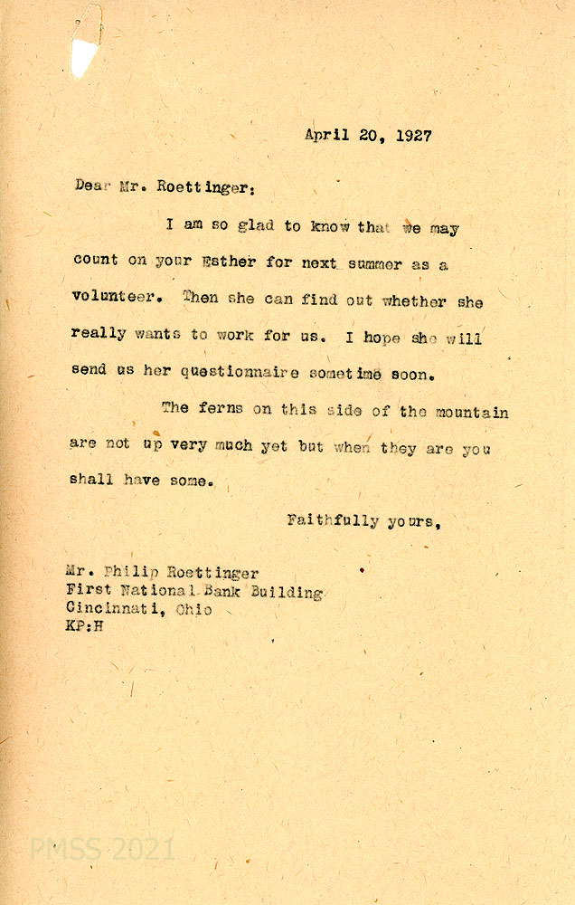 [010] April 20, 1927. To Mr. Roettinger from KP (Pettit), welcoming Esther as a volunteer next summer.