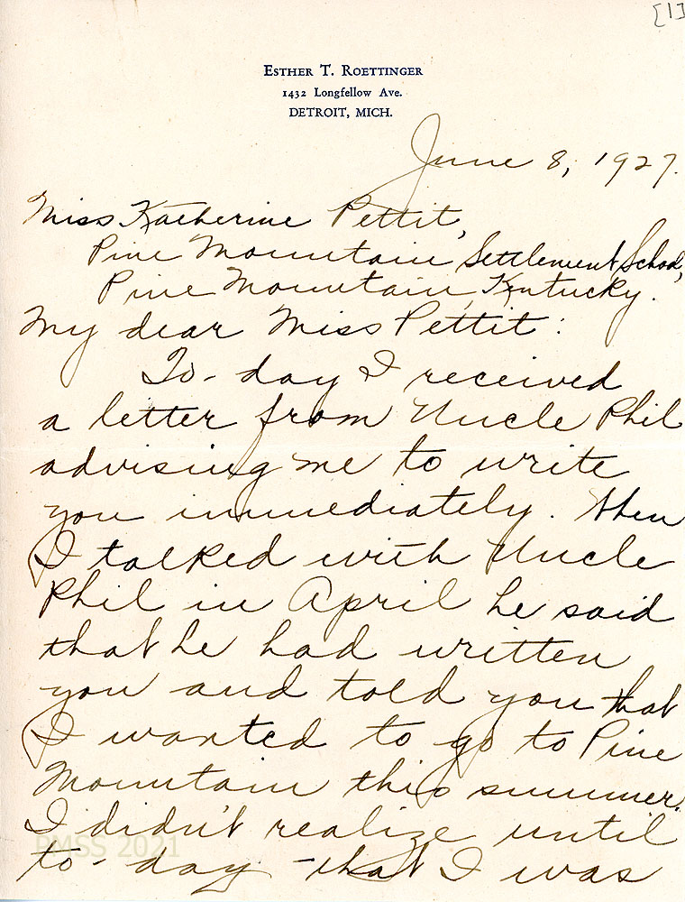 [011] through [011c] June 8, 1927. Four-page letter to Pettit from Esther T. Roettinger in Detroit, MI, [011, page 1] who had just found out from her “Uncle Phil” that he arranged for her to work at PMSS this summer. [011b, page 2] She can leave for PMSS on July 1. “I have had very little actual experience in social work.” [011a, page 3] Besides college courses, she “did case work in connection with one course for a year … volunteer work in Detroit at a small settlement school for a year, …mainly entertainment work. … I am teaching at present and enjoy it but my ambition is to get to Pine Mountain. [011c] Asks for details.