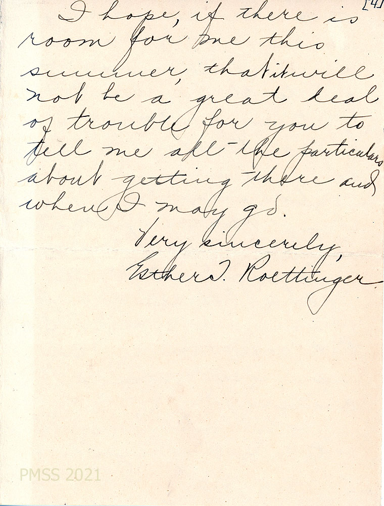 [009] April 18, [no year]. To Katherine Pettit from Mr. Roettinger, who had discussed Esther’s desire to do work in the mountains and decided that she would volunteer for the next summer. “If she shows fitness for the work and wishes to do so, her mother will consent.”