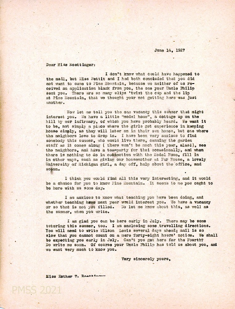 [012] June 14, 1927. To Esther from [truncated page], describing a vacancy at the “model home, a cottage up on the hill by our infirmary…. We want it to be, not simply a place where the girls get experience in keeping house…, as they will later on in their own homes, but one where the neighbors love to drop in. I have been very anxious to find somebody this summer, who would live there, canning the garden stuff…, see the neighbors, and have a tea-party for them occasionally….” Additional activities may be filling in when the Far House housemother takes a day off, help in the office, and possibly some tutoring. Asks for more about her teaching, as there will be one or more vacancies to be filled. Tells her to arrange with Wilson Lewis to help with getting to PMSS.