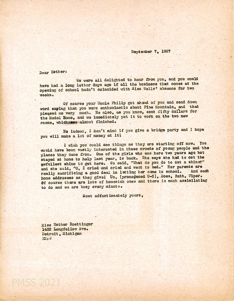 [015] September 7, 1927. To Esther in Detroit from EZ (Zande). “We were all delighted to hear from you….” Mr. Roettinger wrote that Esther was “enthusiastic about Pine Mountain, and that pleased me very much.” He also sent $50 for the Model Home which is being used for work on the two new rooms. Describes the students returning to school.