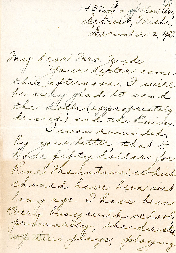 [016] through [016b] December 12, 1927. To Zande from Esther, who is “busy with school, primarily, the direction of two plays, playing the lead in another and much social gaiety…. It must be lovely at Pine Mountain at Christmas time. How I wish I could be there, not only then, but so many times. …” Encloses $50 for PMSS.