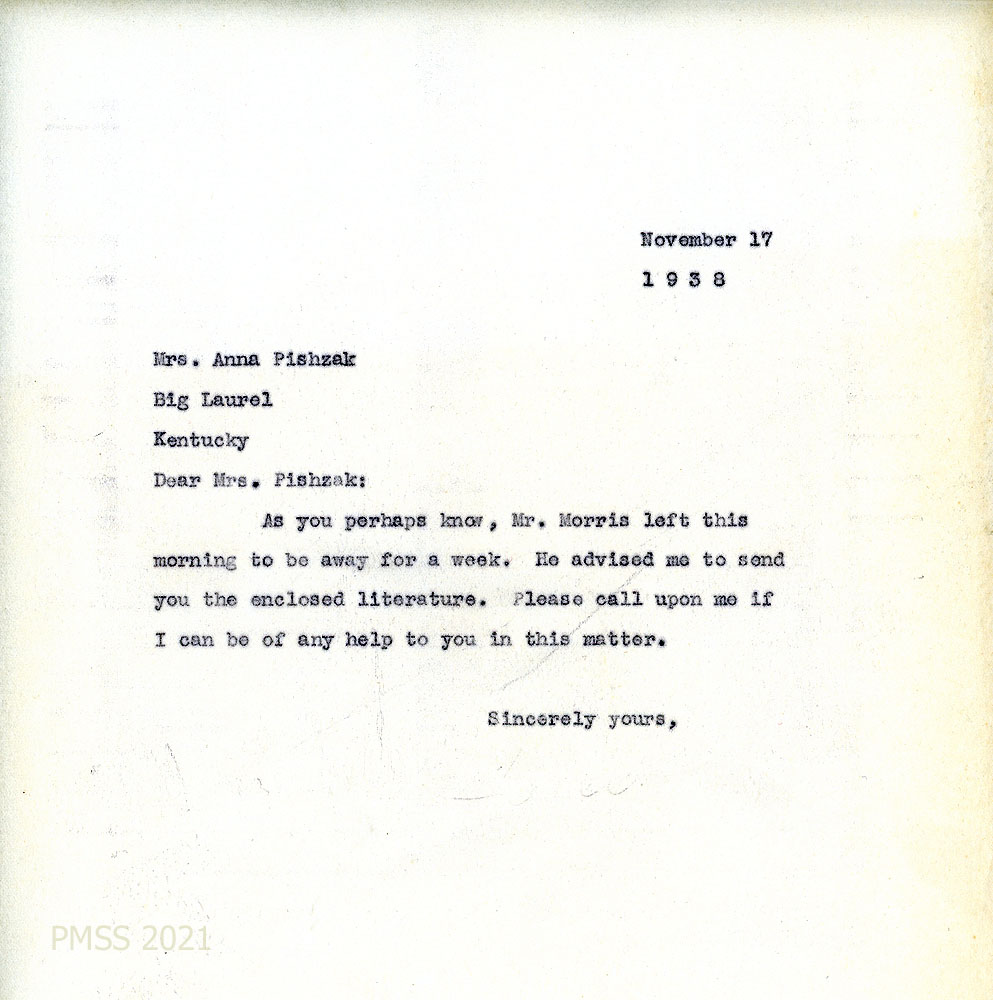 [063] November 16, 1938. To Pishzak from Morris, who asks if Mr. Ellsworth M. Smith can stay at the Medical Settlement while visiting PMSS. He is the Director of Adult Education Cooperative Project, Conference of the Southern Mountain Workers, who is starting clubs of “older people to study their problems together.”