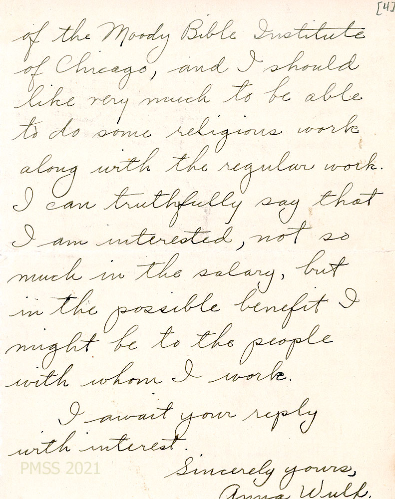 [004a through 004d] March 29, 1925. To Zande from Wulf in Chicago, IL, relating her interest in the vacancy at PMSS, as reported to her by Miss Grace Hood of the Lewis Institute of Chicago. She graduated from Lewis Institute in 1918 with a B.S. in Domestic Economy. “Since graduation, I served as the chemist for a flour milling company for four years, and then as draftsman and supervisor in a large concern where I am at present employed.” No teaching experience except practice teaching at Lewis Institute. Also, graduate of the Moody Bible Institute of Chicago, and would like “to do some religious work along with the regular work. … I am interested, not so much in the salary, but in the possible benefit I might be to the people with whom I work.”