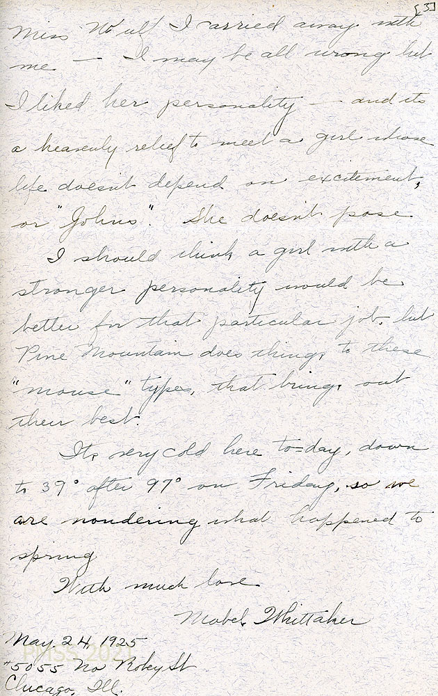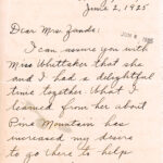 [010] through [010b] May 28, 1925 (hand-stamped). Three-page handwritten letter to Zande from Whittaker, who describes her meeting with Wulf, “a poised, unassuming girl…she has a quiet sense of humor and is the kind of girl I would like to have for a friend. … I should think a girl with a stronger personality would be better for that particular job, but Pine Mountain does things to these ‘mouse’ types that bring out their best.”