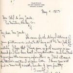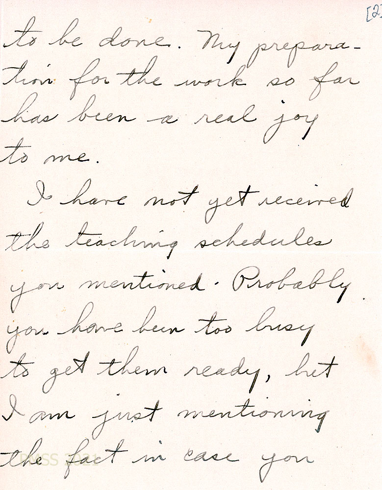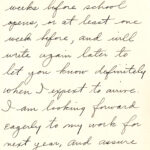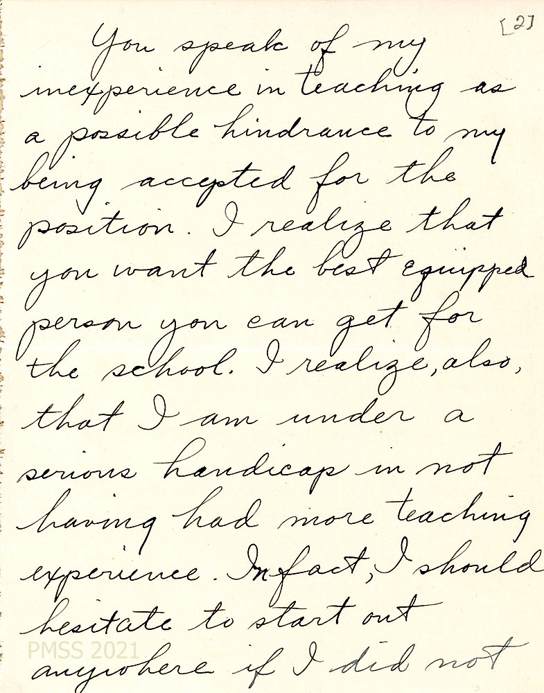 [009] May 28, 1925. To Wulf from EZ (Zande), who heard from Miss Whittaker that Wulf would “fit in here very well.” However, Zande asks if Wulf would wait a couple of weeks while Zande looks into another applicant who has recent teaching experience.