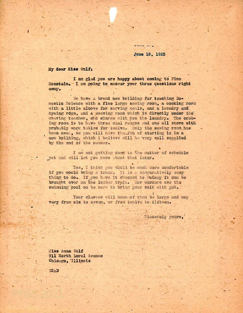 [012] June 9, 1925. To Wulf from [unsigned, apparently Zande], who asks Wulf “to come to Pine Mountain next year as teacher of cooking and sewing from August 24th to May 15th, at $60.00 a month and living.” Describes how little some of the girls know about sewing, cooking, or housework, so her teaching “should be intensely practical.” Asks Wulf to arrive early to become acquainted with the country and the girls. Tells her the type of clothing to bring; Encloses traveling directions.