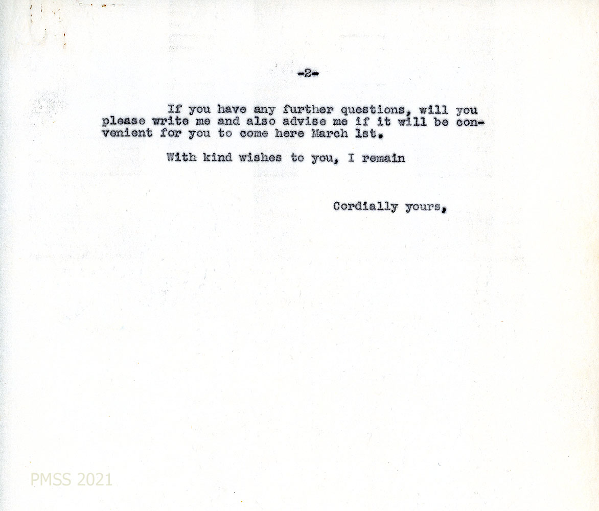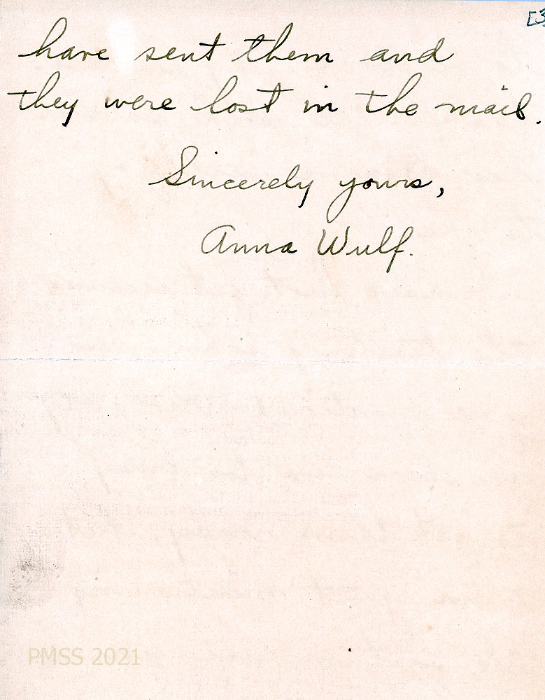 [Note: Letters from PMSS staff in the PMSS Collections are carbon copies, typewritten, unsigned, and meant for the Office files. The original signed copies were sent to the correspondents. The initials at the bottom left of many PMSS letters indicate the writer (along with the initials of the secretary). For example, “EZ” are the initials for Ethel de Long Zande, “KP” refers to Katherine Pettit, and “EKW” to Evelyn K. Wells, “AM” to Angela Melville, and “GAM” to Glyn A. Morris. Letters from Anna Wulf are handwritten unless indicated otherwise. The following list of contents is in chronological order and not necessarily in the order of the image numbers.]