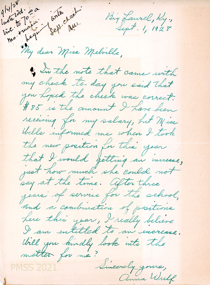 [028] September 1, 1928. To Miss [Angela] Melville from Wulf, who confirms that $85 is her salary “but Miss Wells informed me when I took the new position for this year that I would [be] getting an increase…. After three years of service for the school, and a combination of positions here this year, I really believe I am entitled to an increase….”