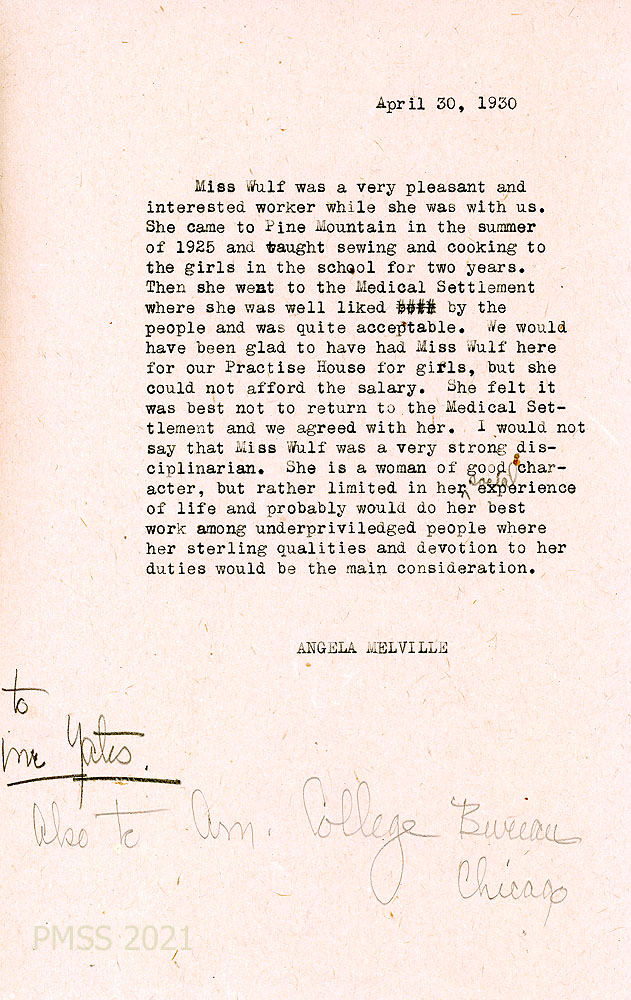[030] April 30, 1930. Reference for Wulf, written by Angela Melville. “She came to Pine Mountain in the summer of 1925 and taught sewing and cooking to the girls in the school for two years. Then she went to the Medical Settlement….” Handwritten notation in margin: “To Mr. Yates. Also to Am. College Bureau, Chicago.”