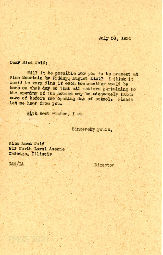 [035] July 30, 1931. To Wulf from GAM, Director (Glyn A. Morris), who asks her to arrive by August 21 to prepare for School opening.