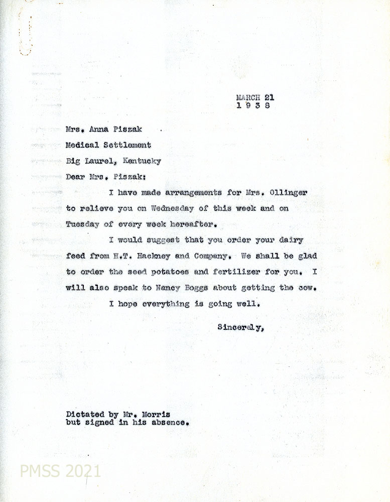 [047] March 21, 1938. To Pishzak at the Medical Settlement, Big Laurel, KY, from Morris, who will arrange for Mrs. Ollinger to relieve her once a week; advises ordering dairy feed from H.T. Hackney and Company; will see Nancy Boggs about the cow.