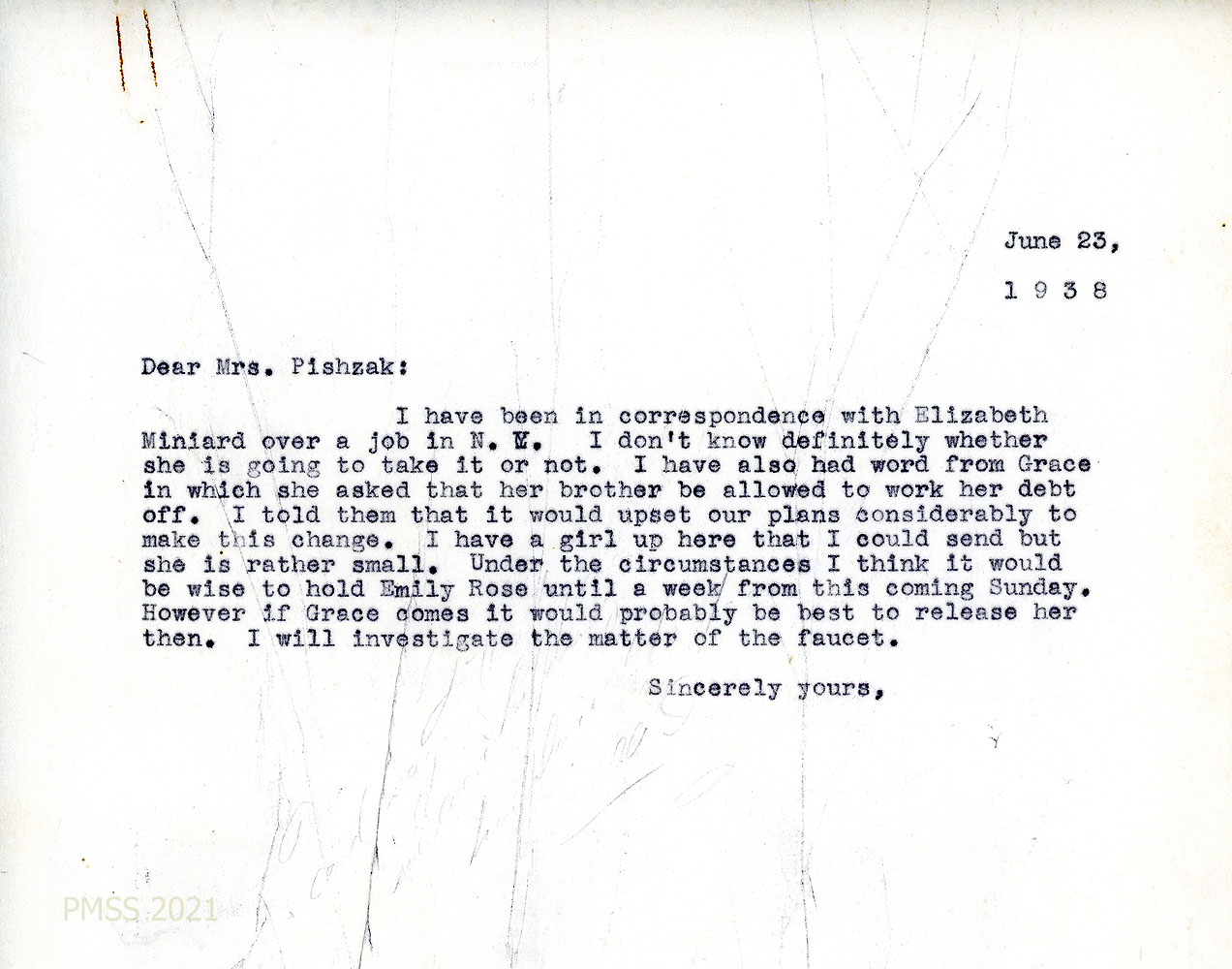 [060] October 5, 1938. Typewritten letter to Morris from Pishzak, who agrees to having Miss Smith in charge.