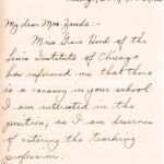 [031], [031a] April 28, 1931. Two-page letter to Wells from Wulf in Chicago, asking “if there will be any vacant position on your staff which I could fill.” She expresses interest in housemother or office work but prefers teaching the primary children.