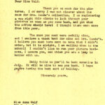 [038] May 12, 1932. TO WHOM IT MAY CONCERN; Reference for Wulf written by Morris. “Miss Wulf is quiet and unassuming but enters whole-heartedly into all of the activities of the school.”