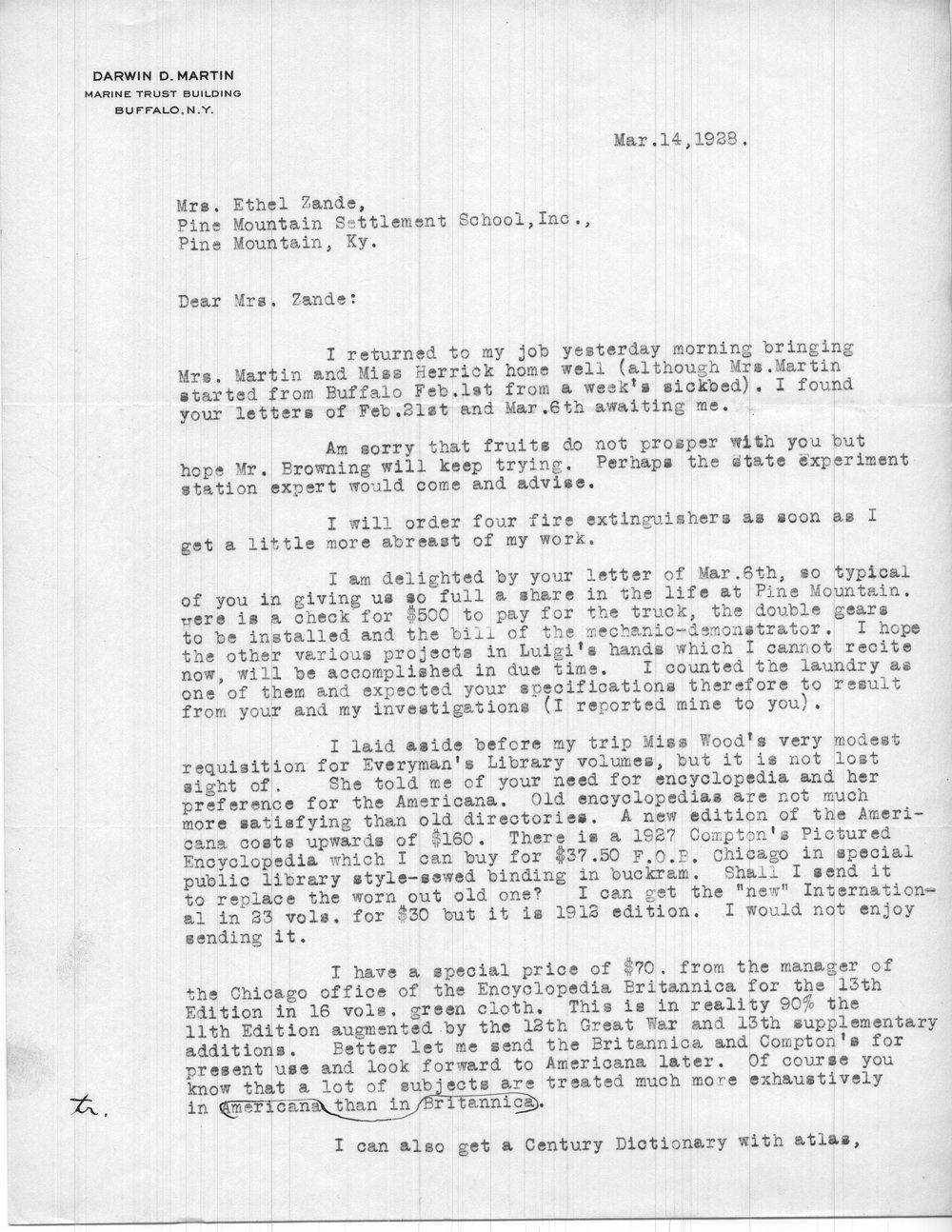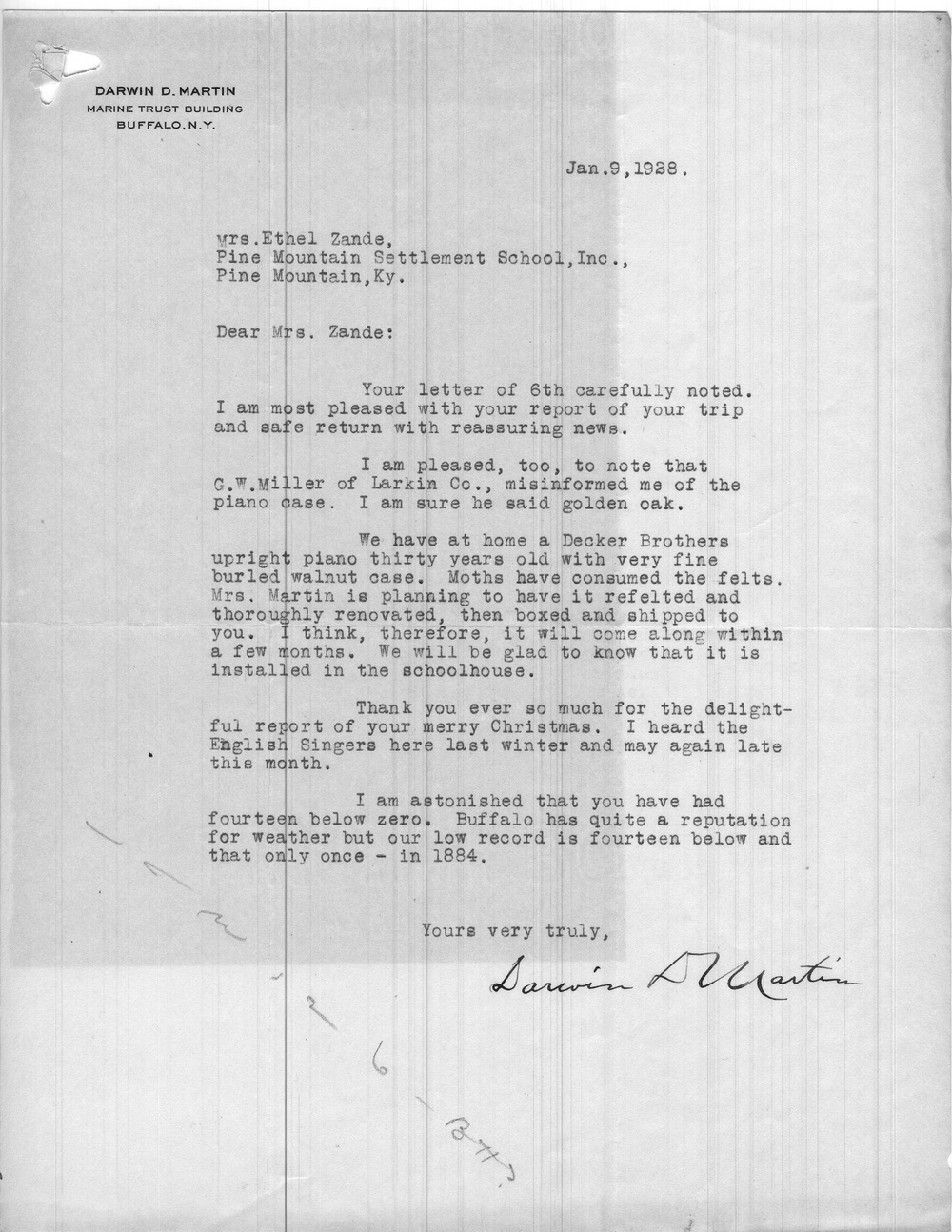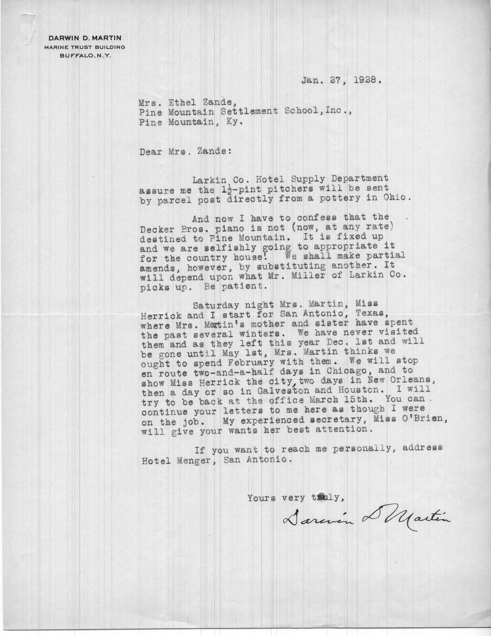 Martin was an avid correspondent. As President of the Board of Trustees at Pine Mountain, he kept a close eye on the School and was very generous with both his time and his money for the School. The following images are samples of his letters to and from Pine Mountain staff in 1928. (Go to DARWIN D. MARTIN 1928 Correspondence for a listing of the contents of each of these letters.)
