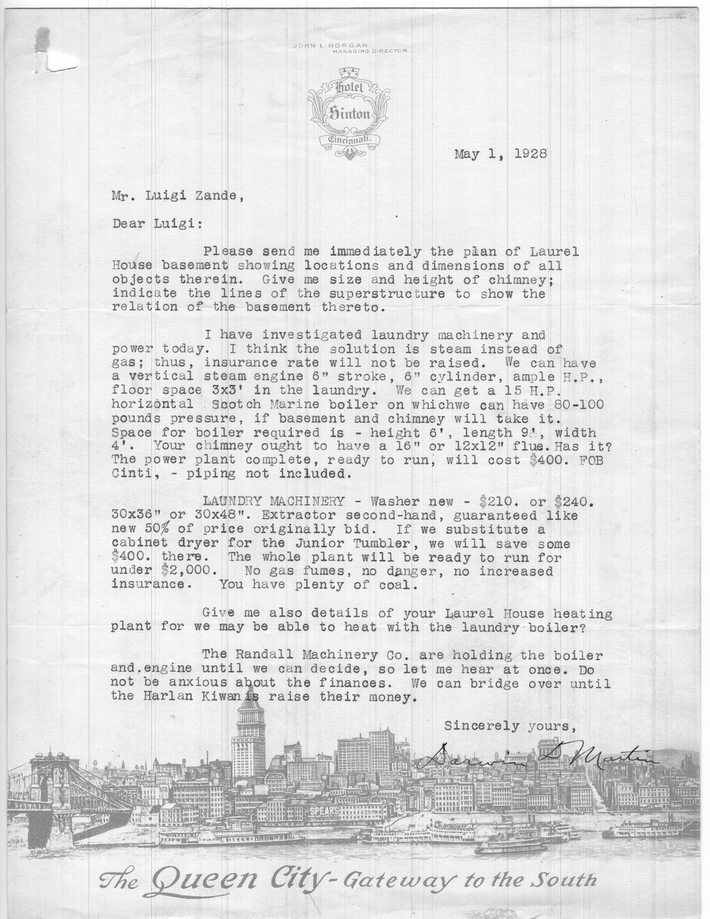 - Old Laurel House I. 1928-05-01 D.D. Martin to Luigi Zande, 1 page. [martin_016.jpg] RE: plans for Laurel House basement and laundry. [martin_016.jpg]