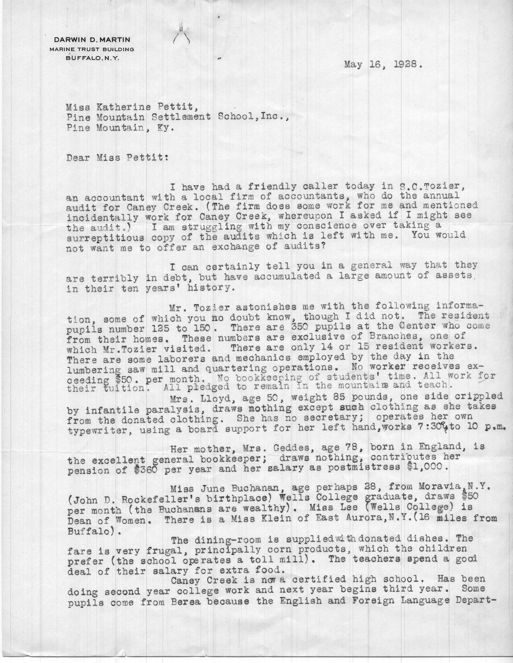 - 1928-05-16 D.D. Martin to Katherine Pettit, page 01. [martin_018.jpg] RE: conditions of Caney Creek settlement school.