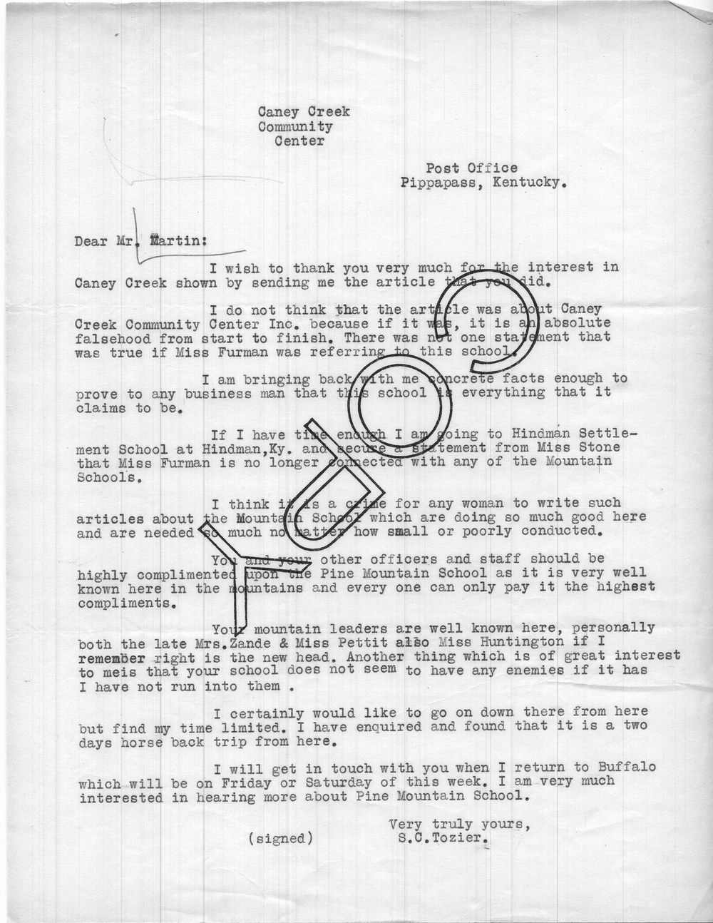 - 1928-00-n.d. To D.D. Martin from S.C. Tozier, 1 page. [martin_022.jpg] RE: conditions of Caney Creek Community Center and surveying community regarding response to Lucy Furman writing.