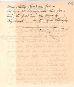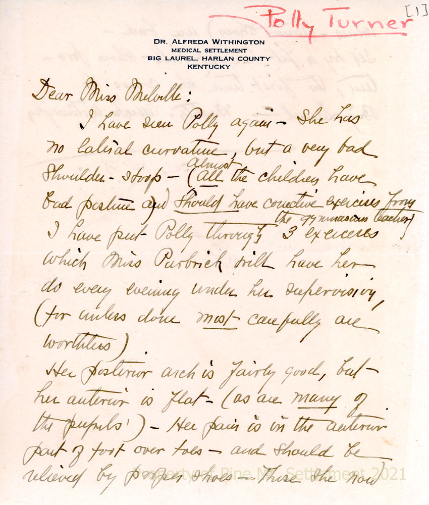 [002], [002a] N.D. Two-page handwritten letter to Angela Melville from Dr. Alfreda Withington, Medical Settlement, Big Laurel, Harlan County, KY, reporting Polly’s need for corrective exercises for her posture under Miss (Marian) Purbrick’s supervision; and for proper shoes for the pain in her foot; offers to fit her with shoes when she comes to Big Laurel.