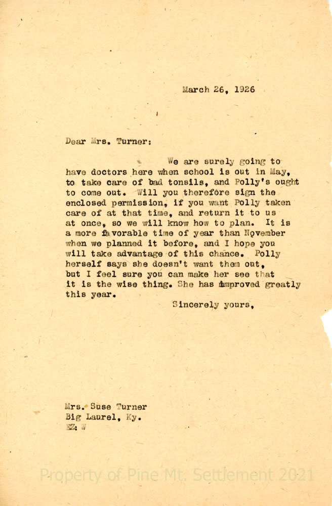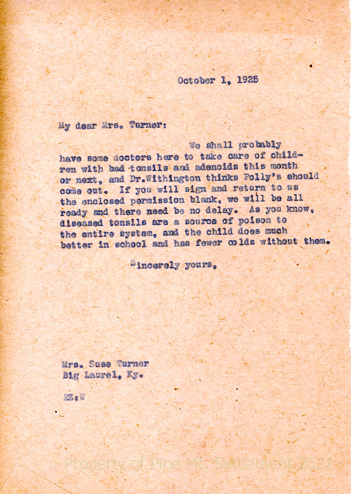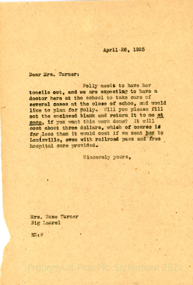 [003] April 28, 1925. To Mrs. Suse Turner, Big Laurel, from EZ (Ethel de Long Zande), informing her that “Polly needs to have her tonsils out. We have a doctor here at the school to take care of several cases at the close of school.” Requests that Mrs. Turner fills out the enclosed blank and returns it. Cost is about $3.00.