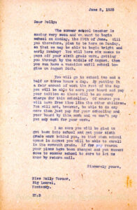 [004] June 8, 1925. To Polly from EZ (Zande), asking her to arrive at the school in time for summer school on June 29. “You will have six weeks to pass off your sixth grade work…. You will go to school two and a half or three hours a day. By putting in a fair amount of work the rest of the day you will be able to earn your board and pay your tuition so there will be no money charge for this schooling. Of course you will have free time like the other children.” This will prepare Polly for seventh grade in August.